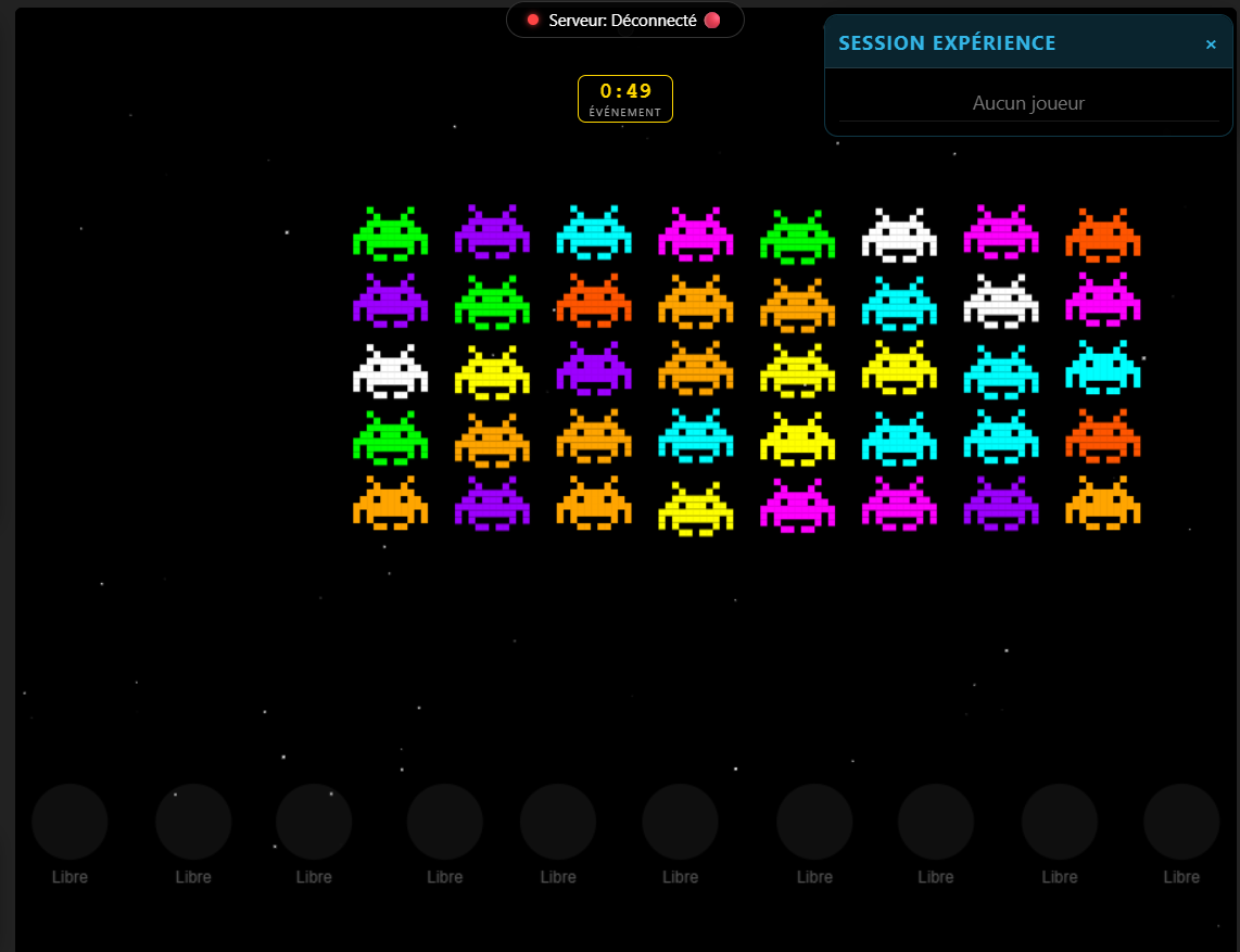 👾 Les aliens sont organisés en grille (5×8 = 40 monstres). Chaque ennemi cache une récompense en points : de 0 (vide 😅) à 4888 ⭐ (jackpot !). Les couleurs sont aléatoires pour que personne ne sache quelle cible vaut combien — c'est la surprise 🎲