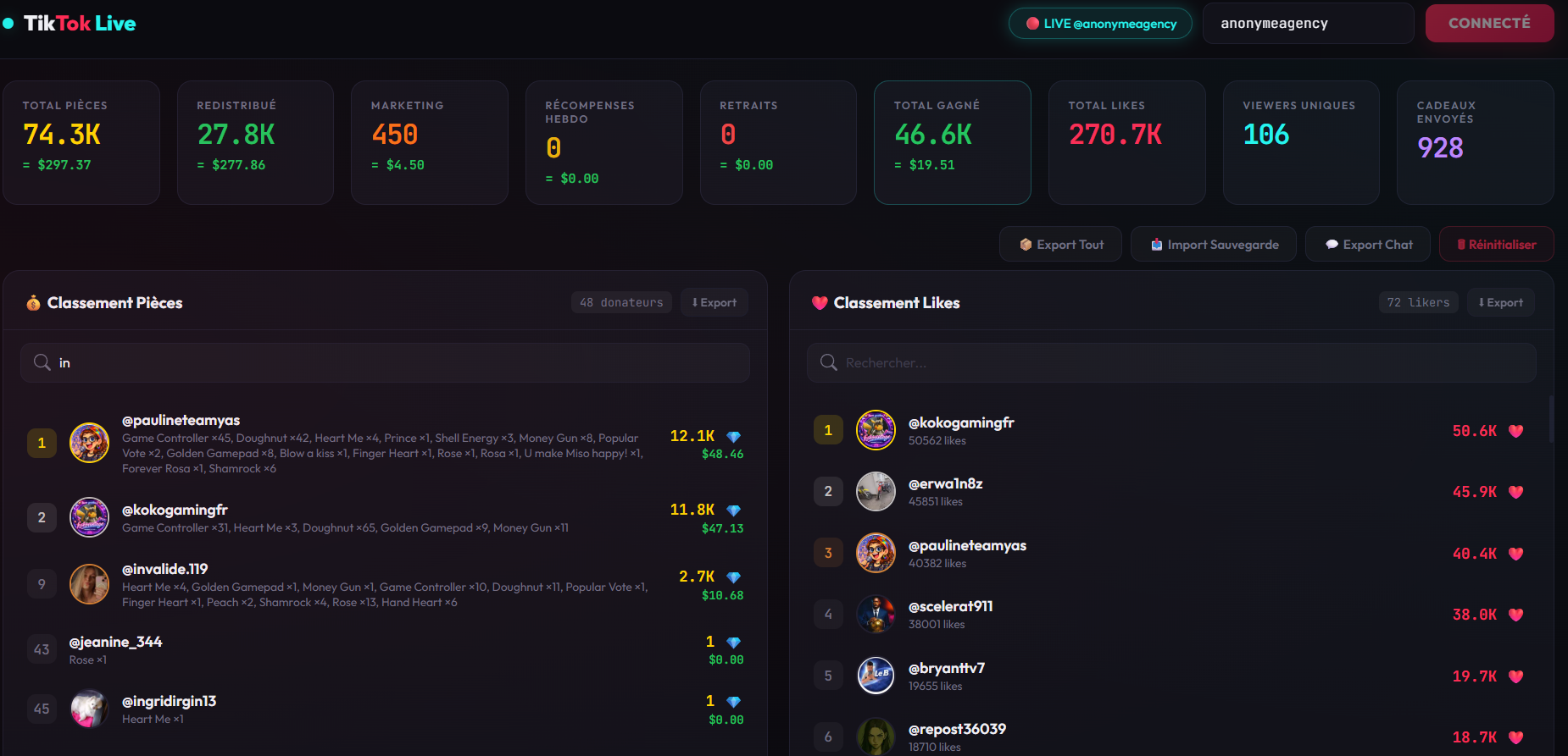 📊 Il y a aussi un système de niveaux/XP 📈, des badges personnalisables par niveau 🏅, des skins de projectiles selon le montant du cadeau 🎨, un gestionnaire de sons complet 🎵, et de l'export/import JSON 💾 pour sauvegarder tout.